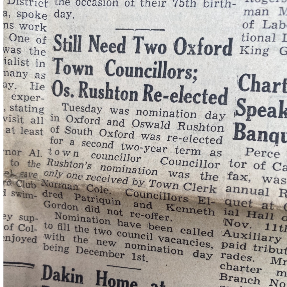 Tuesday was nomination day in Oxford and Oswald Rushton of South Oxford was re-elected for a second two-year term as town councillor. Councillor Rushton’s nomination was the only one received by Town Clerk Norman Cole. Councillors Eldred Patriquin and enneth Gordon did not re-offer. Nomination have been called to fill the two council vacancies, with the new nomination day being December 1st.