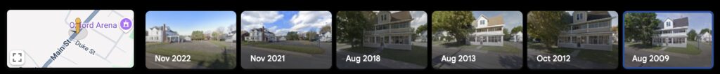 Of the many tools available for historical research, one of my favourites for not-too-old research is Google Maps, specifically, Google Street View. While it works slightly differently in the web browser vs cellphones, you can use it to go back in time to see street-level locations at different points over the years… whenever the Google Maps camera car happened to come by.