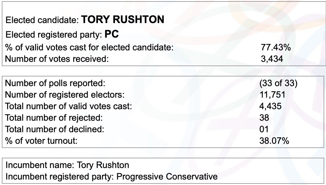 It was never expected to be otherwise. Incumbent Cumberland South MLA Tory Rushton of Oxford is being sent back to the legislature. In his third consecutive victory over challengers from the Liberal Party and New Democratic Party, the Minister of Natural Resources and Renewables in Tim Houston’s 2021โ€“2024 government will form a part of the supermajority that will shape the province’s future over the coming years.