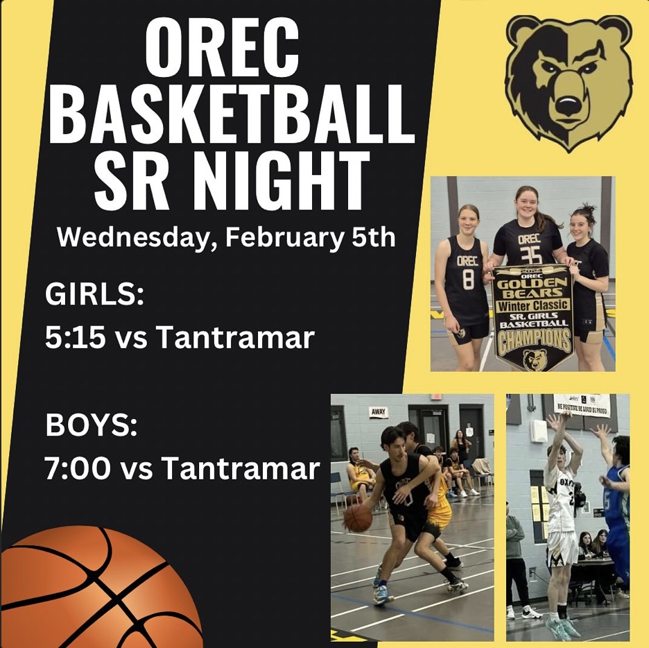 Events OREC Basketball Senior Night By Contributed - February 3, 2025 0 317 FacebookTwitterPinterestWhatsApp OREC Basketball Senior Night Wednesday, February 5th GIRLS: 5:15pm vs. Tantramar BOYS: 7:00pm vs. Tantramar
