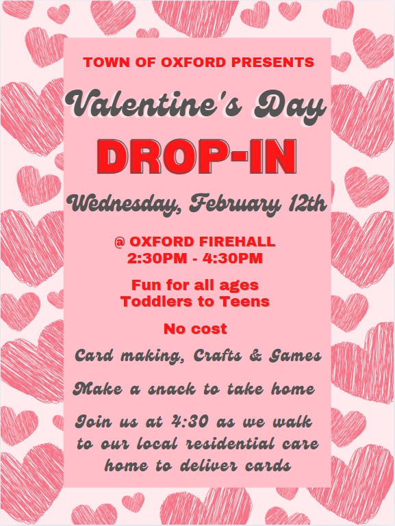 Town of Oxford presents: VALENTINE'S DAY DROP-IN Wednesday, February 12th at the Oxford Fire Hall 2:30pm-4:30pm Fun for all ages Toddlers to Teens No Cost Card making, crafts & games Make a snack to take home Join us at 4:30 as we walk to our local residential care home to deliver cards.