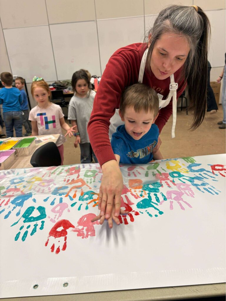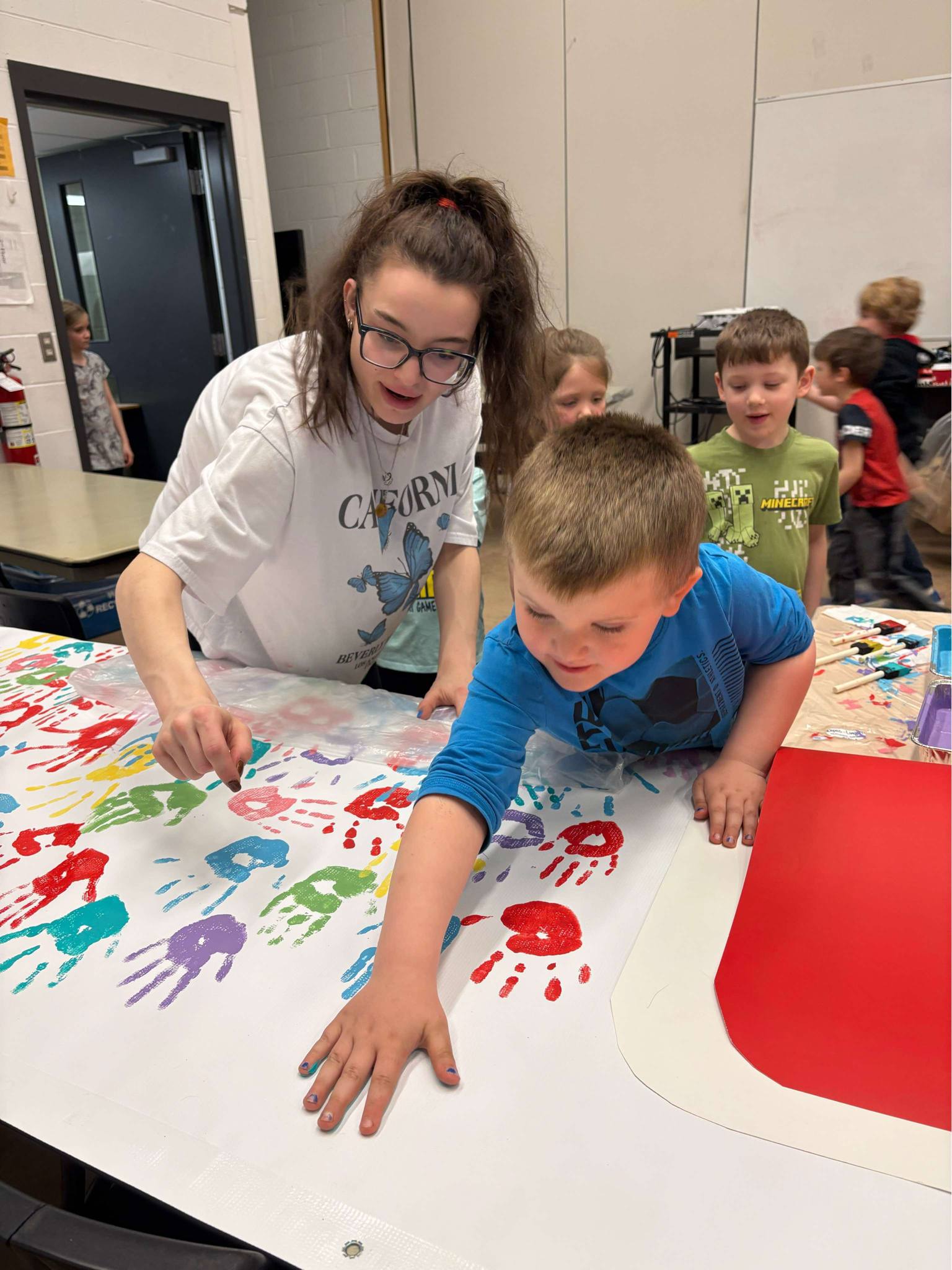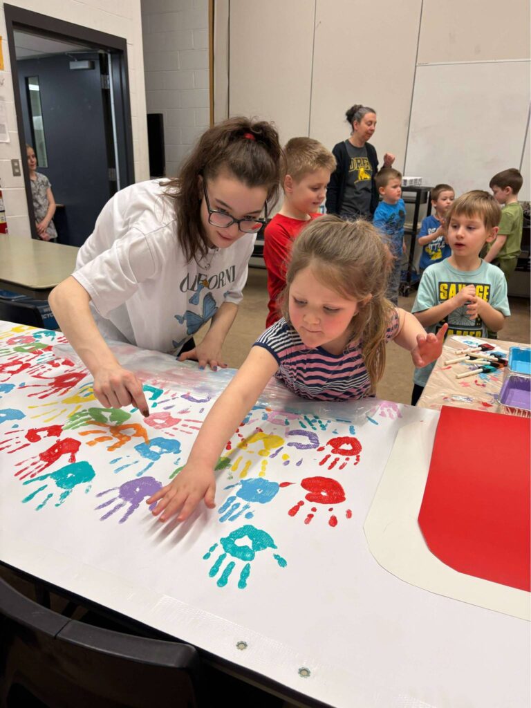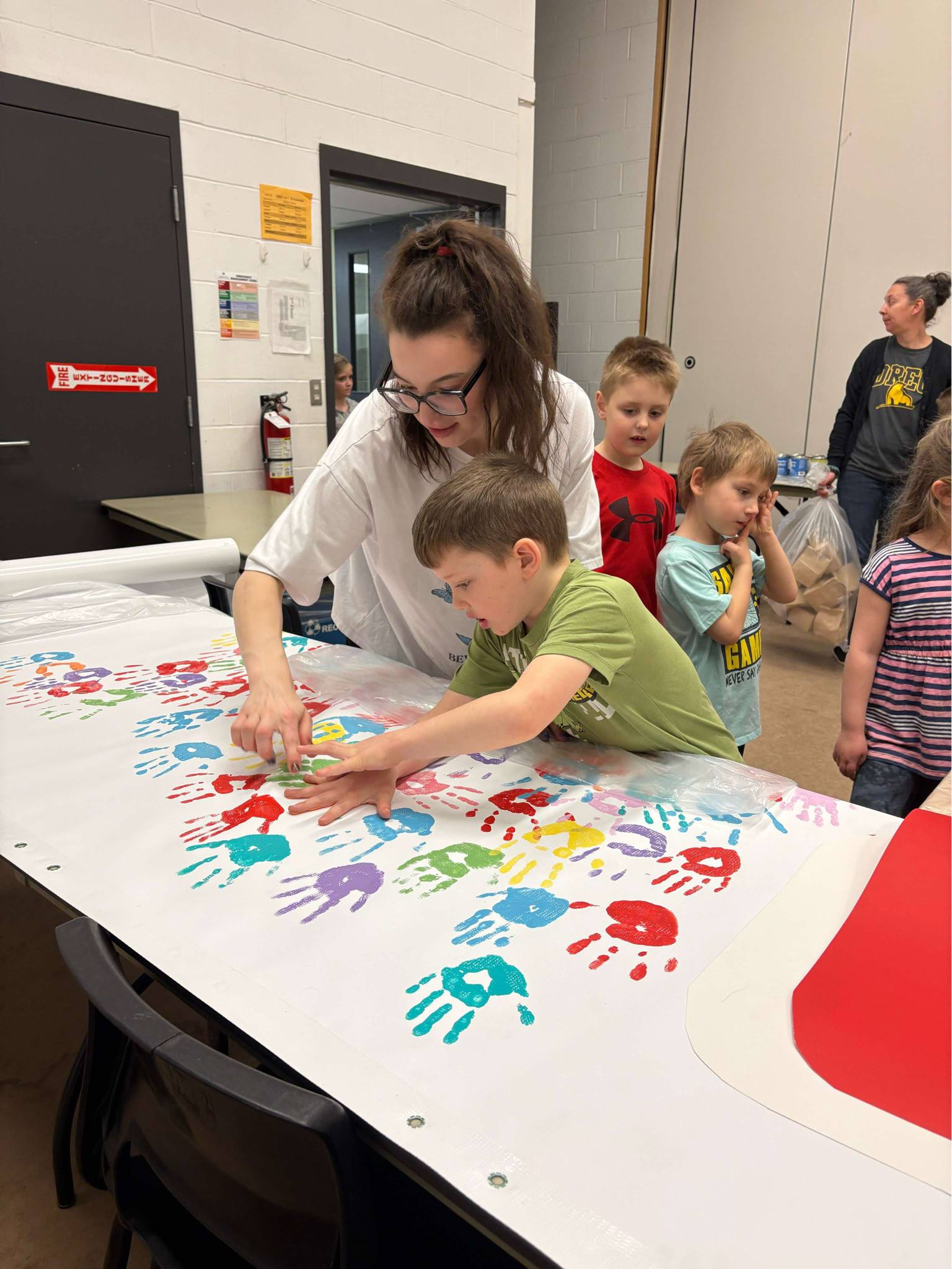 Working on community awareness for the new recreation centre are students at OREC, who added painted handprints on boards that will be hung in the new building once construction is complete. The project completed in April involved OREC students Haley Jacklin, Kaylee Bird, Sydney Blanch, Carley Oickle, and Heather MacDonald, with teacher Angela MacDonald overseeing the effort.