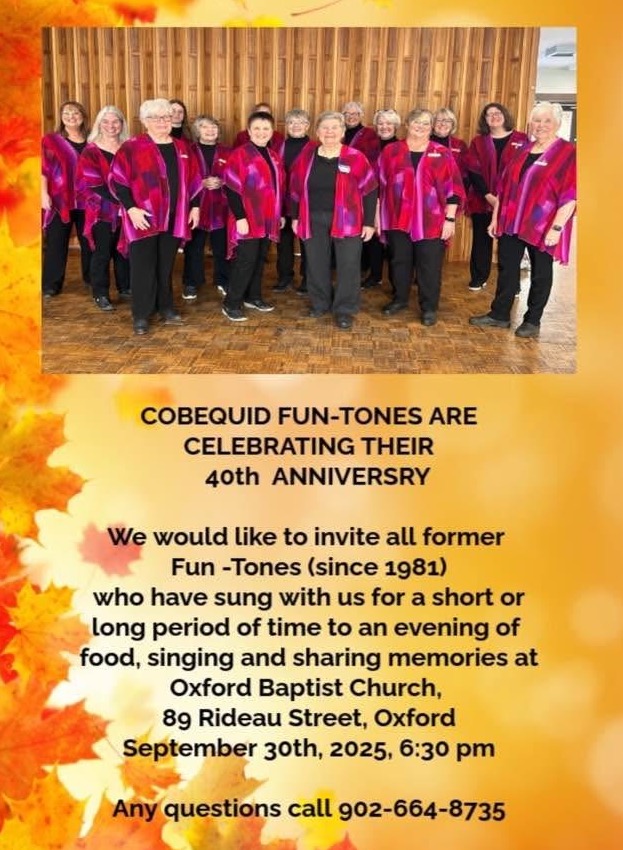 It’s been forty years of joy in song, as the Cobequid Fun-Tones celebrate their anniversary with an evening of food, singing and sharing memories at the Oxford Baptist Church on September 30th. This is an event for current and past members, and any woman who is interested in exploring what the group has to offer. A public event is coming up on November 1st — see below!